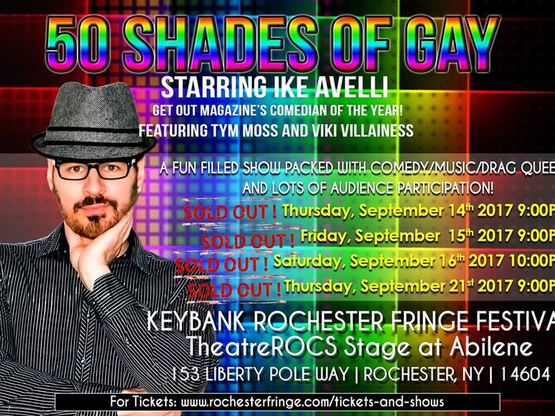 "50 Shades of Gay" was a hit in NYC during PRIDE and SOLD OUT Bally's in Atlantic City Summer 2019. It was also part of the 2017,2018 and 2019 Rochester Fringe Festival and SOLD OUT all four nights each year. The Huffington Post called it "the performance of the summer", while hailing Ike Avelli as the "mastermind of creativity".
