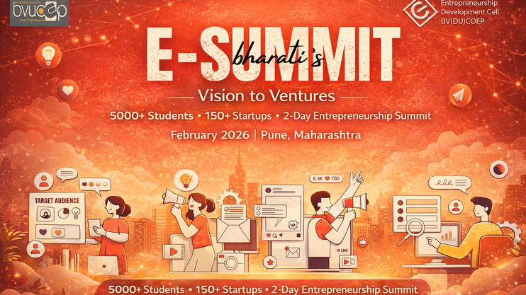 E-Summit 2026 is a 2-day flagship entrepreneurship event organized by the Entrepreneurship Development Cell (E-Cell), Bharati Vidyapeeth (Deemed University) College of Engineering, Pune.