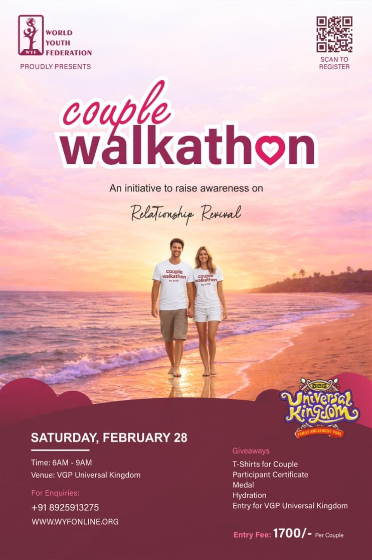 The Couple Walkathon – Love Walks for Open Talks is a unique awareness-driven community event designed to celebrate love, communication, and healthy relationships. Organized by the World Youth Federation, this initiative brings couples together for a symbolic 3 KM walk, encouraging meaningful conversations, emotional bonding, and relationship revival in a fun and engaging environment.