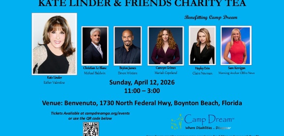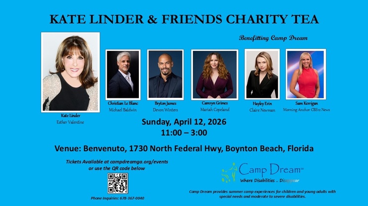 Join Kate Linder & Friends First Annual Charity Tea for Camp Dream in South Florida with Kate Linder, Christian Le Blanc, Bryton James, Camryn Grimes, Hayley Erin, and Sam Kerrigan, Morning Anchor CBS12 News. All proceeds go to Camp Dream.