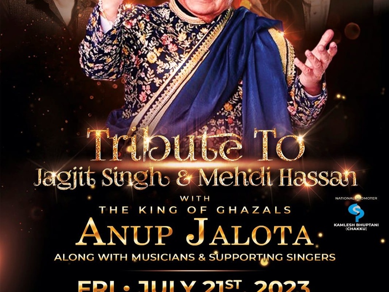 We at KZ Entertainment are proud to present Padmashri - Anup Jalota & team!! Anup JalotaLet's relive the unforgettable moments of Gazals & Shayaris - Tribute to Jagjit Singh and Mehndi Hassan - by truly gifted Vocalist, hearing his timeless voice live at your doorstep!