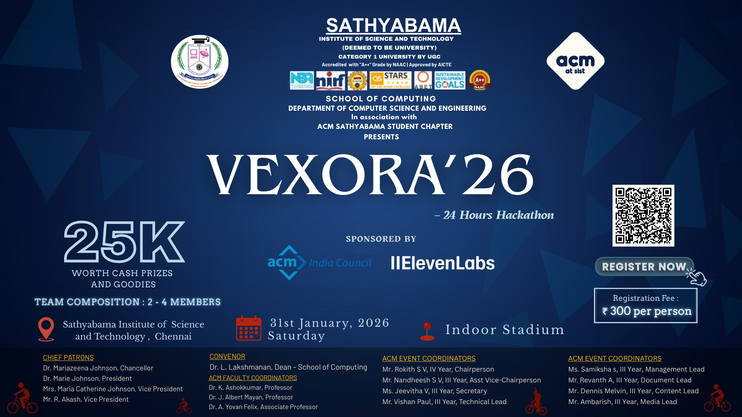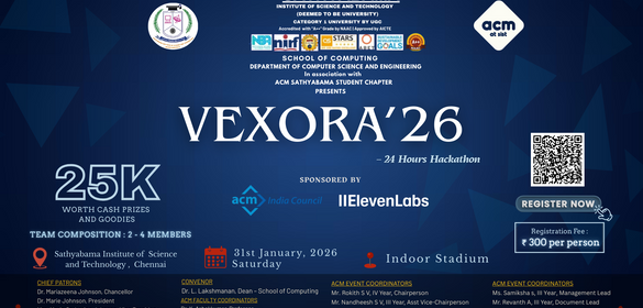 The ACM Sathyabama Student Chapter is the official campus chapter of the Association for Computing Machinery (ACM) at Sathyabama Institute of Science and Technology (Chennai, India). It was established to build a vibrant community of students passionate about computing, innovation, and technology-driven problem solving. Sathyabama University
